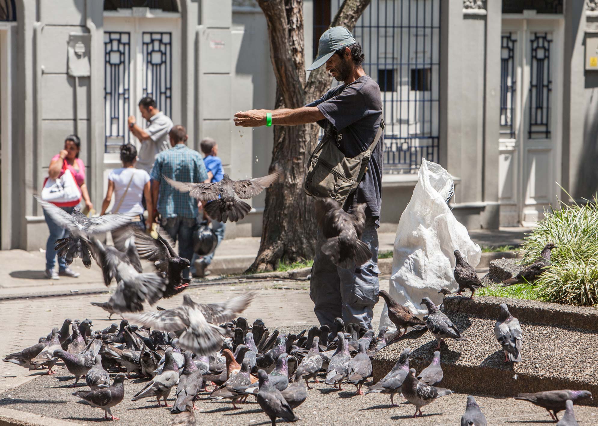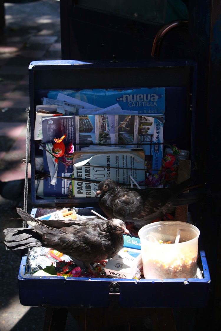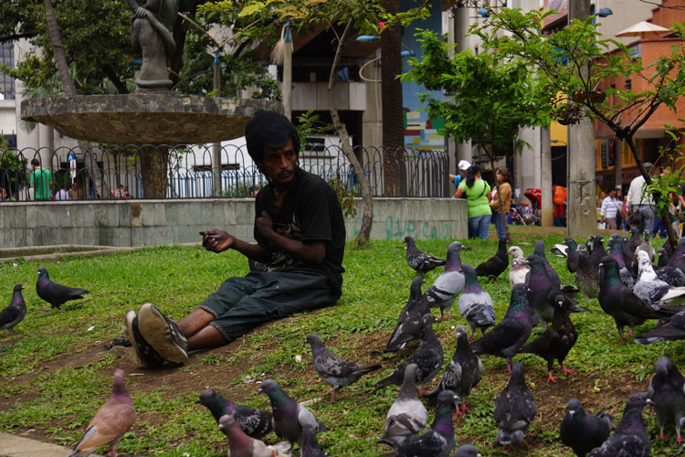 Y una vez una de las señoras vino a insultarme, venía con un bastón de hierro, y cuando me agaché para recoger algo me pegó durísimo con esa cosa en la cabeza; me desmayé, me desperté bañado en sangre, me llevaron a un dispensario a que me cosieran. La policía del parque me dijo que no había pruebas contra la señora y yo no presenté denuncia. Ella nunca se volvió a aparecer, siquiera, gracias a Dios. A los tres meses supe que se había muerto, seguro fue de remordimiento. Otra plaga son los gamines que llegan con unas bolsas grandes donde hay unos cuantos maíces, las abren allá junto a la fuente, llega una paloma y se mete en la bolsa y ahí mismo la cierran y salen corriendo hacia la Minorista, donde las venden en los restaurantes a mil pesos cada una para que hagan caldo pa los clientes. Una cosa tan horrible. Yo les digo a los que vienen a insultarme diciéndome que ‘esas hijuetantas son ratas del aire’ que entonces ellos ni siquiera son humanos sino ratas sin alas, y con eso se van fríos… Y la mayor satisfacción de mi vida, contra todos los malos tiempos, es recordar que he cuidado y sanado a miles de palomas en invierno y en verano, en Navidad y Semana Santa, domingos y festivos durante estos 32 años. Esto no es un jobi sino una vocación como la de los apóstoles de Cristo: puro amor y dedicación sin descanso, hasta que Dios me lleve”.
