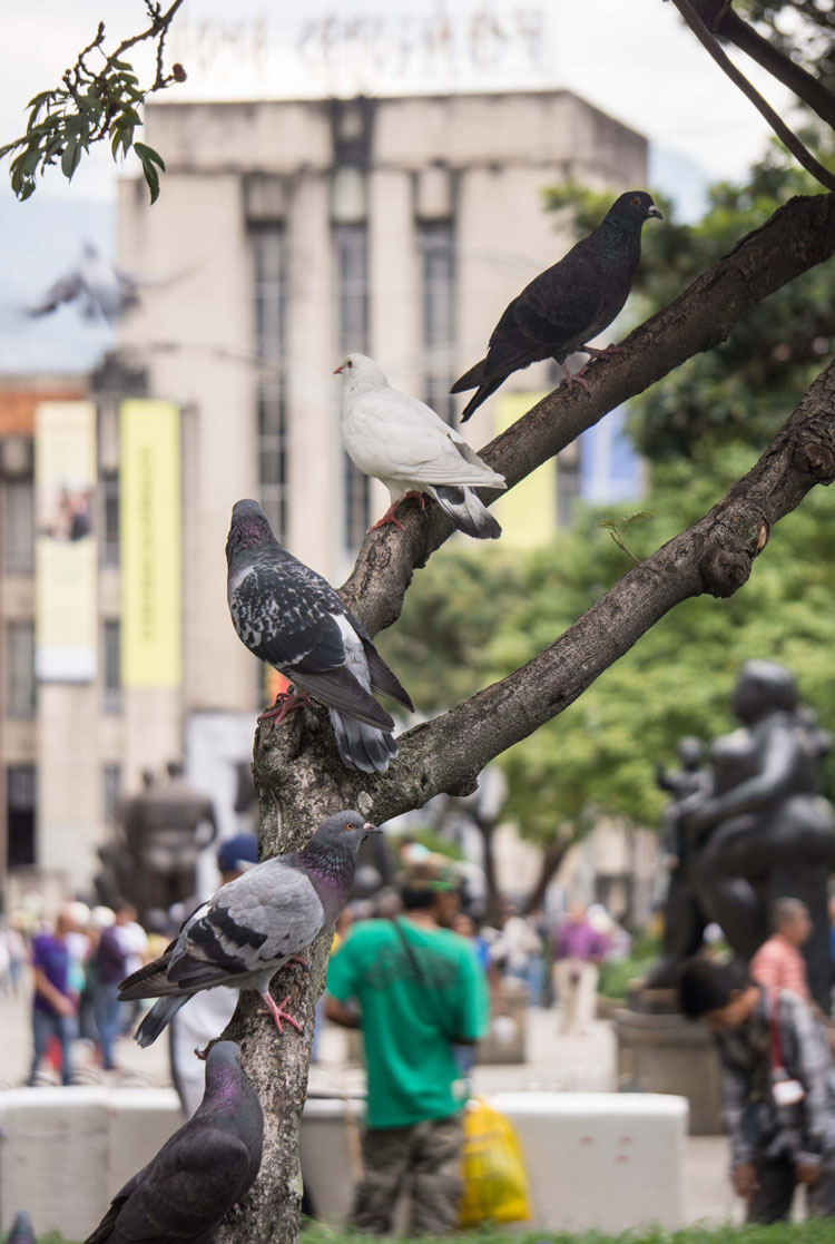 Y a propósito de cómo las palomas de los parques suelen padecer cada cierto tiempo las furias de sociópatas que les envenenan el maíz y matan centenares, don Óscar cuenta: “hace como unos diez años alguien que odiaba las palomas, seguro por considerarlas ‘ratas del aire’, eso tan feo y que no es verdad, bueno, uno de esos maníacos envenenó en un día a las palomas de la Plazuela San Ignacio, y también a las mías, tirándoles maíz en este parque, al otro extremo, junto a la fuente de la Catedral. Yo apenas las vi tambaliándose llamé al municipio; mandaron veterinario, dijo que no había nada qué hacer sino barrer todo ese maíz envenenado y esperar a ver cuántas palomas quedaban, dizque pobrecitas. También vinieron estudiantes de zoología y de veterinaria de dos universidades, se llevaron algunos cuerpecitos, pero luego me dijeron que no sabían las causas y que yo sabía más que ellos, que les podía dar clases, porque yo les conté qué hacía con las palomas cuando se enfermaban, que les daba ampicilina en pastillitas y otras píldoras terminadas en ‘lina’ que vienen de la penicilina, según me han dicho; esas medicinas me las regalan o me las venden baratas aquí en las farmacias vecinas. Y como usted puede ver, vienen aquí palomas de todos los colores, de las llamadas abuelitas y torcazas que son las que más abundan, y muy escasamente las blancas puras, creo que ya hay muy poquitas en Medellín, ¡parece ser cierto que se las roban los satánicos metaleros para hacer exorcismos! Tampoco habitan por aquí ya las palomas rumanas, las gigantes, ni las abanicos ni las capuchinas ni las buchonas que parecen señoras platudas sacando pecho desde las patas hasta el pico, se fueron del todo. Y cómo le parece la que me pasó una vez: en estos edificios del parque viven señoras dizque muy educadas y aristocráticas, pero no sé por qué odian de muerte a las palomas, será porque de pronto les cae una caquita en sus balcones, y vienen a insultarme porque alimento y cuido ‘a esas hijueputas’.